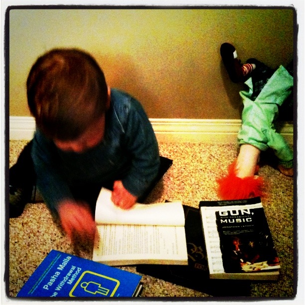 Today while I was working on the new book, Alden toddled into my office, grabbed a Mark Leyner book from the shelf, and then toddled off down the hall again. Later he came back and pulled some more books off the shelf to read. I guess I can’t complain. Now if I only knew where he’d put that Leyner book….