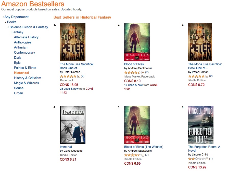 But back to that cause and effect. I was a kids’ fun park most of the day, playing subterranean mini-golf with my son — yes, apparently subterranean mini-golf is a thing — so I didn’t have my usual time to obsessively browse Amazon. Damn kids adding to my quality of life! Late at night, after everyone was in bed, I finally got around to checking Amazon to see if the CBC thing had connected me with any new readers. I was totally blown away by what I saw. The Mona Lisa Sacrifice managed to hit the No. 1 and No. 3 spots in Amazon.ca’s Historical Fantasy bestsellers (for paperback and Kindle versions) and No. 3 and No. 5 in Amazon’s Contemporary Fantasy bestsellers — bookending Gaiman’s American Gods at No. 4! It even hit No. 3 and No. 5 on the Canadian Literature bestsellers.