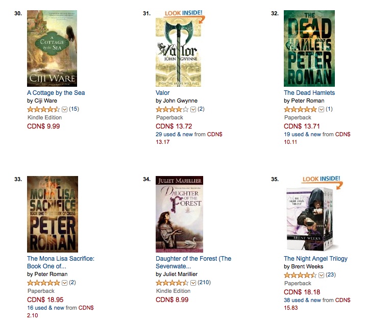I was blown away and excited to see The Mona Lisa Sacrifice hit No. 5 in Amazon.ca’s Contemporary Fantasy bestseller list, while The Dead Hamlets hit No. 9. Mona Lisa also hit No. 7 in Amazon’s Historical Fantasy bestsellers, while Dead Hamlets hit No. 9. I don’t think any of my books have charted that high before. As a bonus, The Mona Lisa Sacrifice hit No. 25 in the CanLit bestseller list. I never expected to be a CanLit bestseller at all with these books!