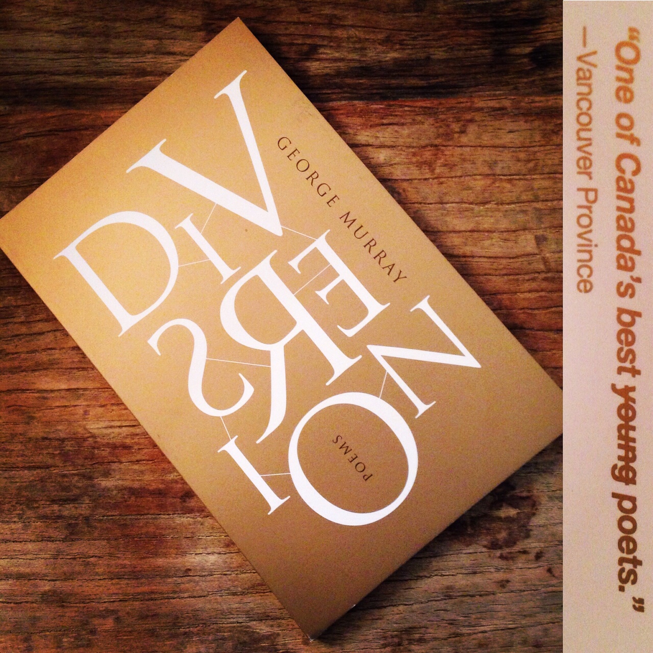 I’m happy to be reading the latest poetry from my pal George Murray. It’s a crazy little book, with poems made of the ceaseless babble of modernity’s data streams (here’s a teaser). They read like Facebook updates crossed with news headlines crossed with overheard conversations and all the rest of the cacophony of our daily lives. Only, you know, poetic. Plus, the quote on the back cover is from me!